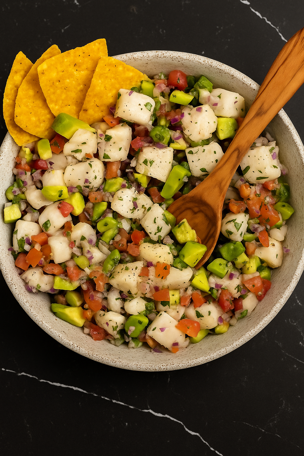 3. Drain and mix: Once opaque, drain off about half the citrus juice (leaving some keeps it juicy). Add red onion, tomato, cucumber, chili, mango, and cilantro. Toss gently.