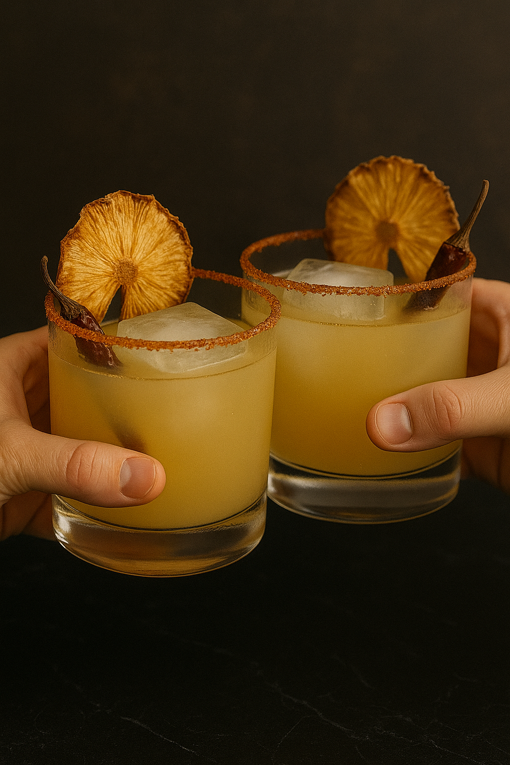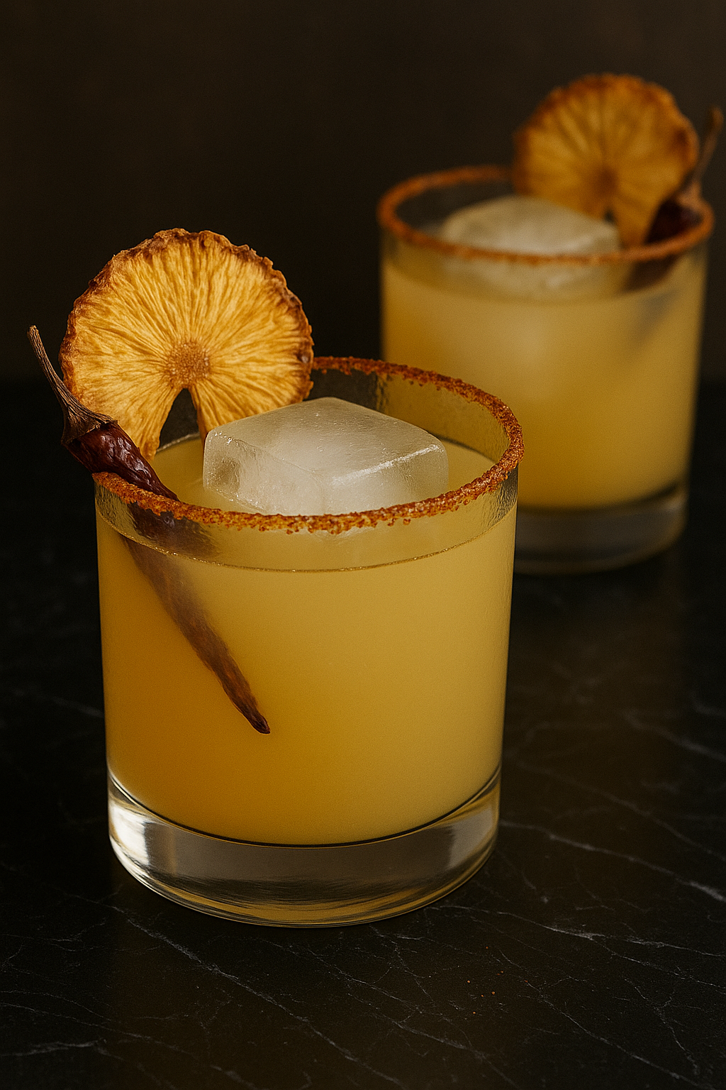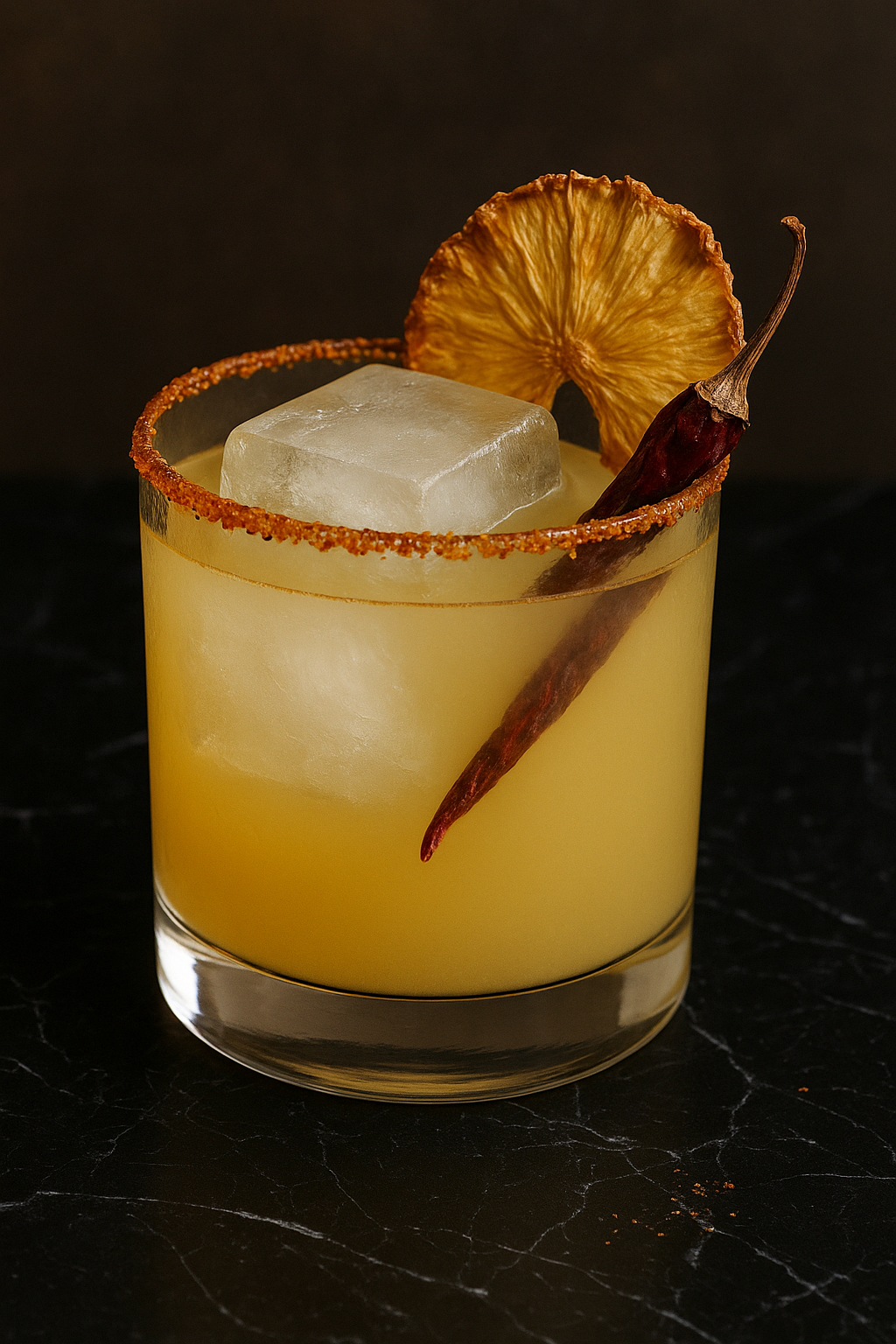 - Garnish: with pineapple wedge and/or dried chili pepper.