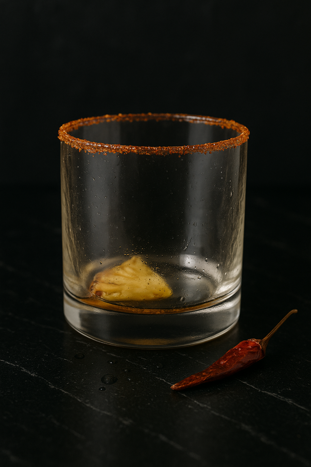 - Prepare the glass: Run a lime wedge around the rim of a rocks glass. Dip the rim into Tajín to coat it evenly.